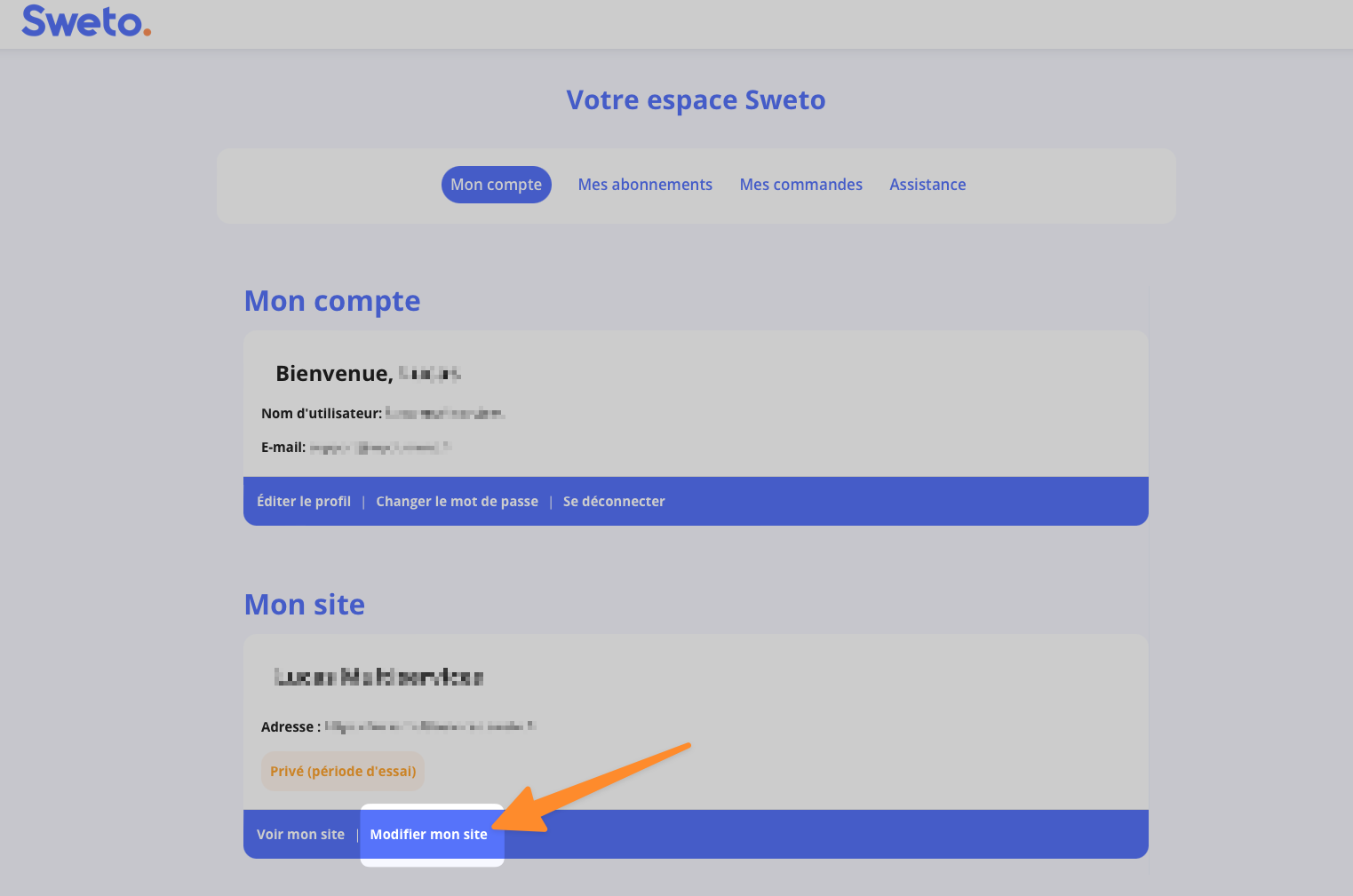 Vous avez aussi la possibilité de vous connecter via votre espace Sweto, en cliquant sur le lien « Modifier mon site«