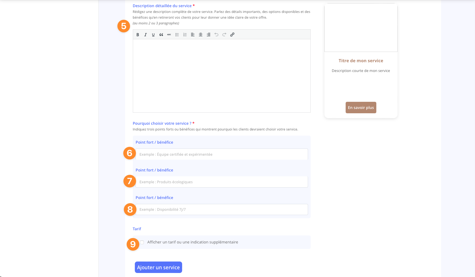 6. 7. 8. Points forts ou bénéfices : Renseignez trois éléments clés qui expliquent pourquoi vos clients devraient choisir ce service. Par exemple : une prestation unique, un excellent rapport qualité/prix ou une expertise reconnue.