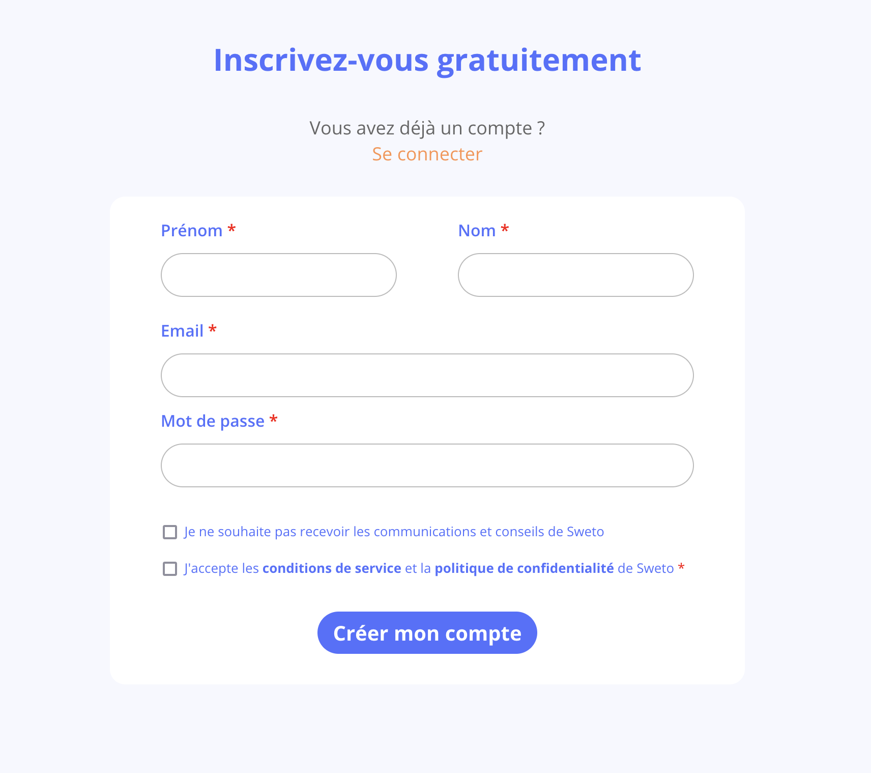 Pour créer votre compte Sweto, cliquez sur ce lien : S’inscrire et créez mon site internet