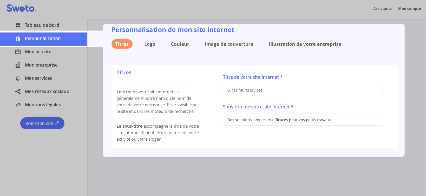 Vous pouvez y modifier le titre et le sous-titre de votre site pour refléter votre activité, ajouter votre logo, et personnaliser les aspects graphiques du thème choisi. Changez la couleur principale pour correspondre à votre identité visuelle, remplacez l’image de couverture pour accueillir vos visiteurs avec style, et mettez à jour la photo de profil ou l’illustration de votre entreprise pour présenter une image professionnelle.