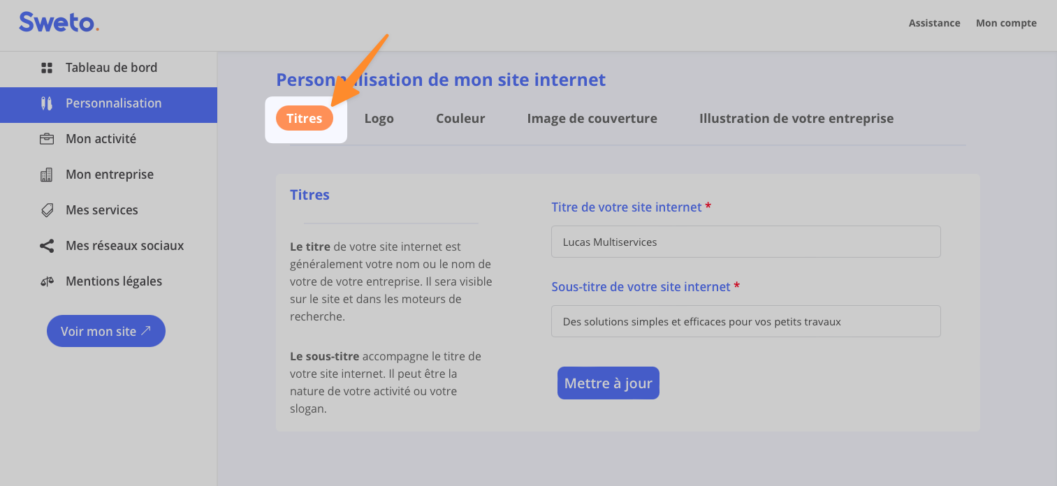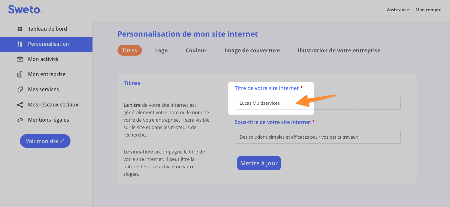 Le titre de votre site internet est généralement le nom de votre entreprise ou de votre projet. Il est affiché sur votre site et dans les résultats de moteur de recherche.