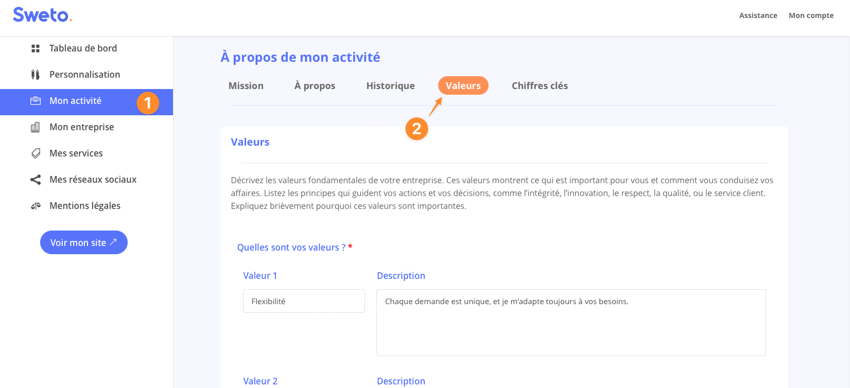 Les valeurs fondamentales de votre entreprise, accessibles dans le menu “Mon activité”, sous le sous-menu “Vos valeurs”, sont essentielles pour refléter ce qui est important pour vous et comment vous conduisez vos affaires.