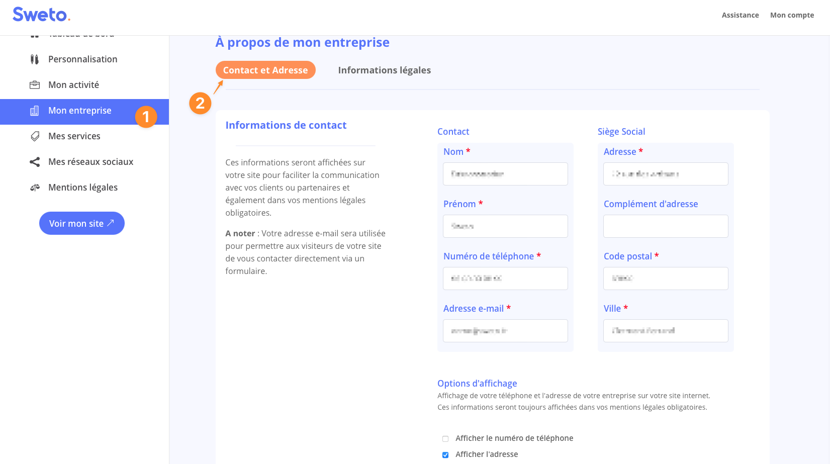 Votre adresse e-mail est utilisée dans le formulaire de contact, tandis que votre adresse physique et votre numéro de téléphone peuvent être affichés ou masqués selon vos préférences. Ces informations apparaissent également dans vos mentions légales, comme l’exige la réglementation.
