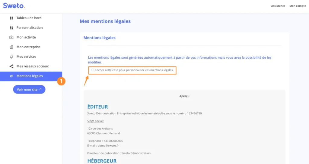 Cochez la case « Cochez cette case pour personnaliser vos mentions légales » pour modifier le texte et/ou ajouter des mentions particulières en lien avec votre activité.