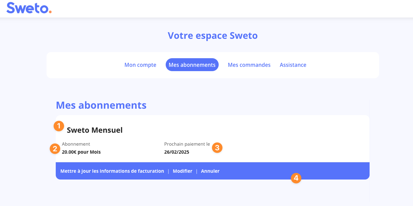4. Menu d’action pour modifier vos informations de facturation, modifier votre formule ou annuler votre abonnement.