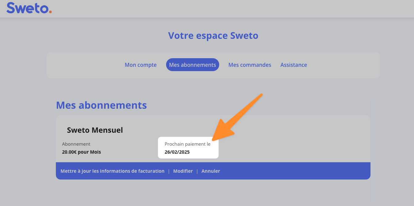 Vous pouvez consulter la prochaine échéance de paiement de votre abonnement actif.